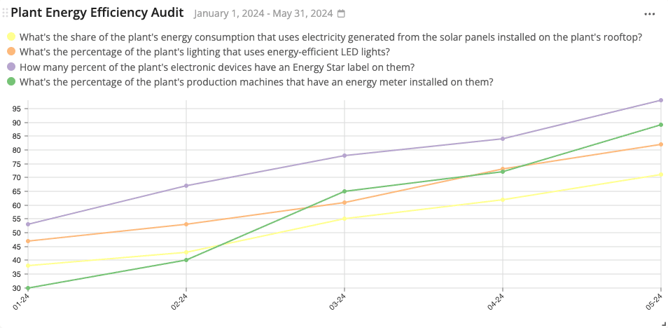 This widget displays data captured from number-based checks (except torque checks) in audits over time – in the format of a line chart. For example, data about the temperature of a machine, the energy consumption of a plant, the monthly downtime of an assembly line, etc.