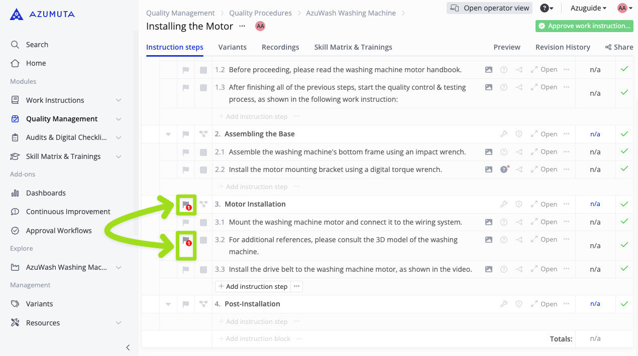 - Select whether to display the andon issue from this andon board on the related instruction step & instruction block on the work instruction editor, as shown in the image below (please pay attention to the highlighted flag icons):