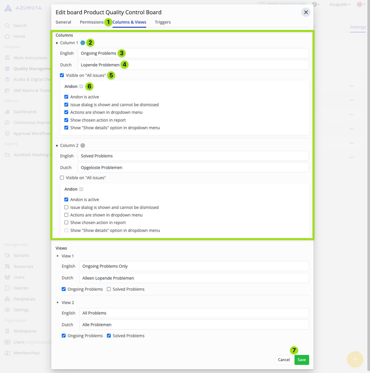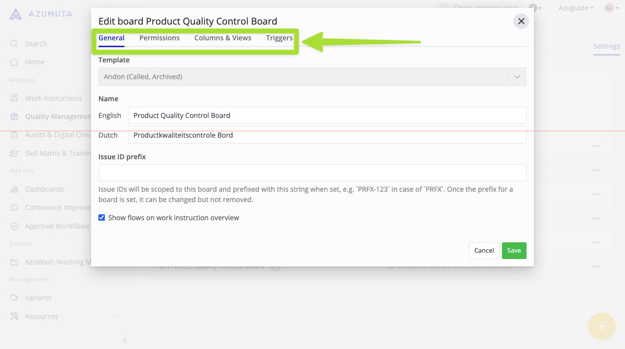 This tab allows you to edit columns within an andon board and adjust their visibility. It consists of two main settings: the Columns Settings and Views Settings, which we will further explore in the two guide sections below.