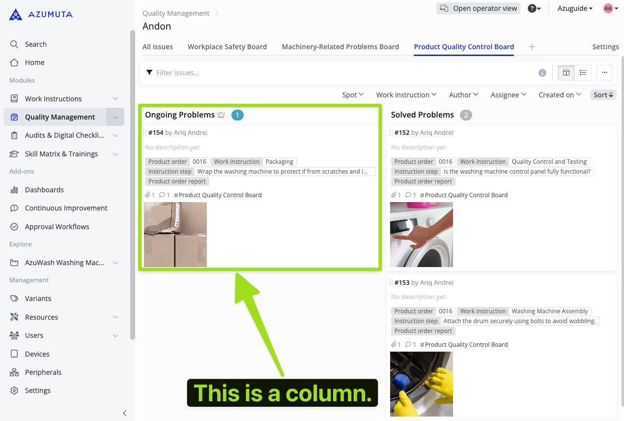 In an andon board, a column represents the status of an andon issue, such as the “Ongoing Problems” column shown in the screenshot below. On this andon board, there are 2 columns in total (the Ongoing Problems and Solved Problems columns).