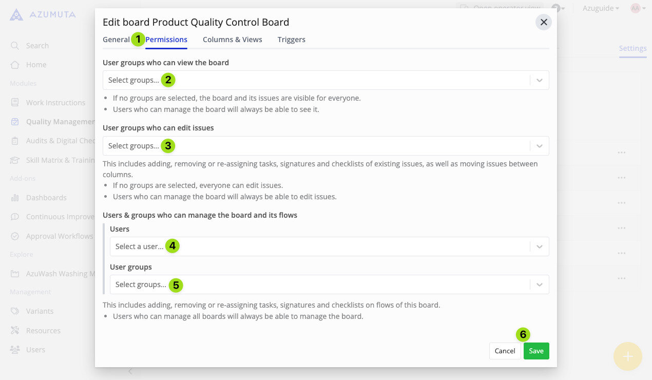 - Select which user group(s) can manage this andon board and all andon flows that fall under it.
