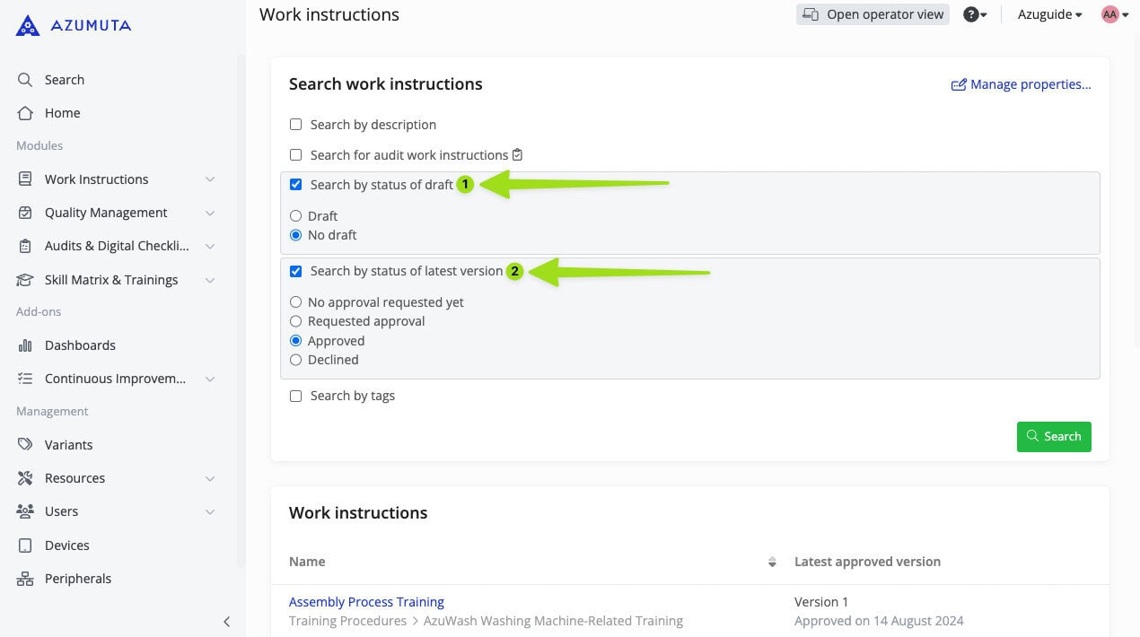 - Whether the displayed work instructions are still a draft (where their latest version hasn’t been approved yet) or they’re not a draft (where their latest version has been approved).