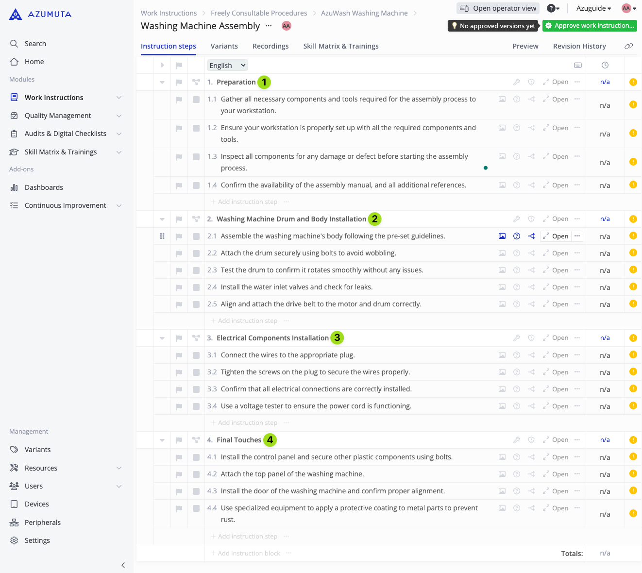 - Navigate to the work instruction where you would like to add an instruction block.