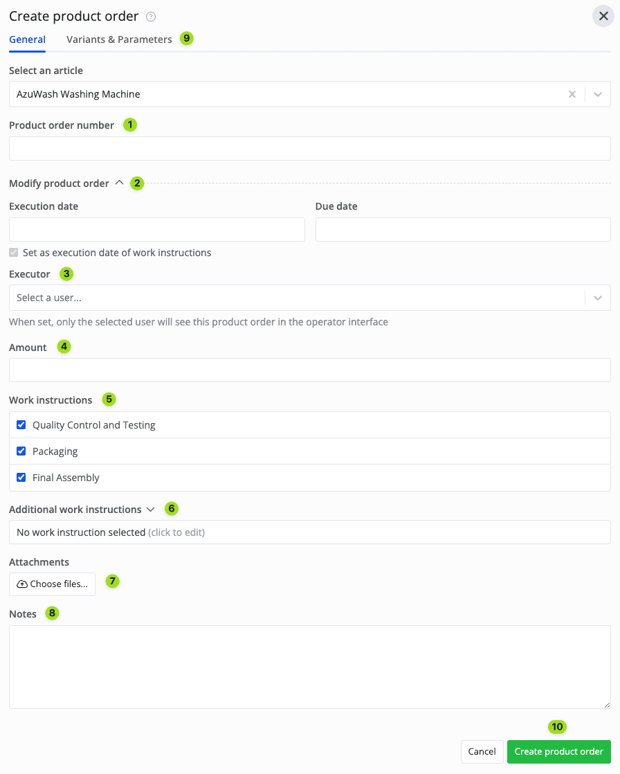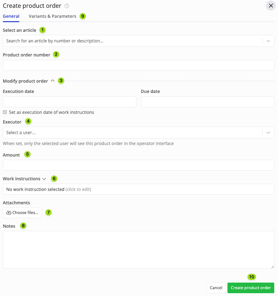 Note: While you can create a product order with this method, we recommend creating a product order based on an article or ERP input instead. That way, all instructions, variants, and parameters are already pre-configured. Thus, you don't have to manually configure them on your own each time you're making a new product order.