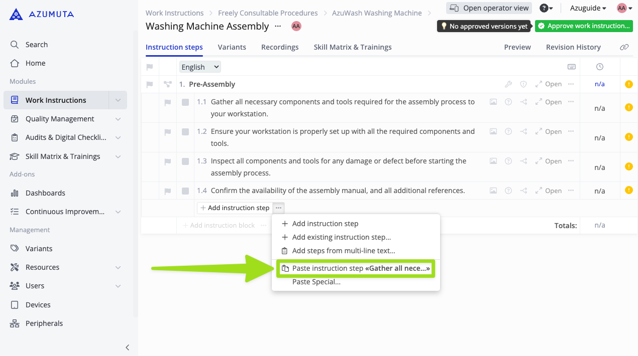 - Navigate to the targeted work instruction for where you would like to paste the content.
