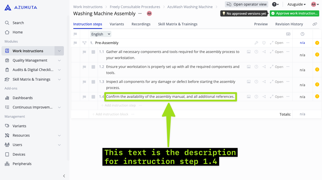 In Azumuta, each instruction step must have a description. An instruction step’s description generally contains a written command that an operator must follow when using that work instruction. Please take a look at the image below to see where you can find the description of an instruction step.