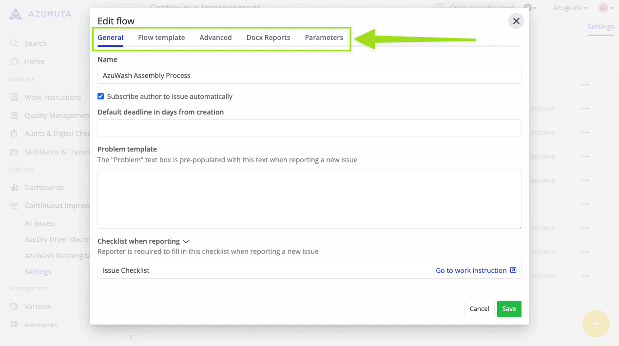 You can add parameters to an improvement flow. These parameters will be listed on all tickets that fall under this improvement flow’s umbrella, as well as on all checklists that are linked to those tickets.