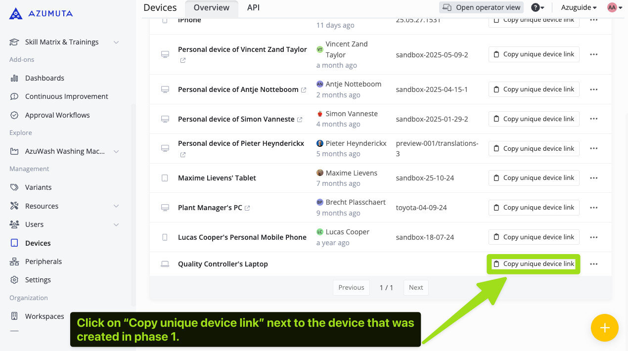 - Click on “Copy unique device link” next to the device that was created in phase 1 for your operators. The unique device link will then be copied into your clipboard.