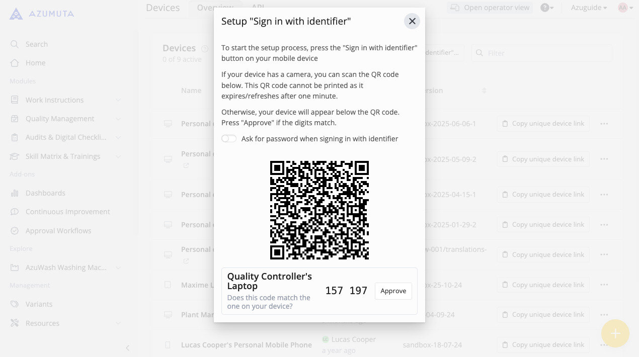 - There are two possible methods to authenticate the device that will be used by your operators. The first method is by scanning the barcode shown in the image below using the device that will be used by your operators (you can only use this method if the device has a camera/barcode scanner). The second method is by clicking on “Approve” next to the six-digit numbers (if you use this method, please ensure that the numbers are exactly the same as the numbers on step No.5). Additionally, if you want the operators using this device to login using their identifier code and their password, you should switch on the “Ask for password when signing in with identifier” toggle, shown in the image below.