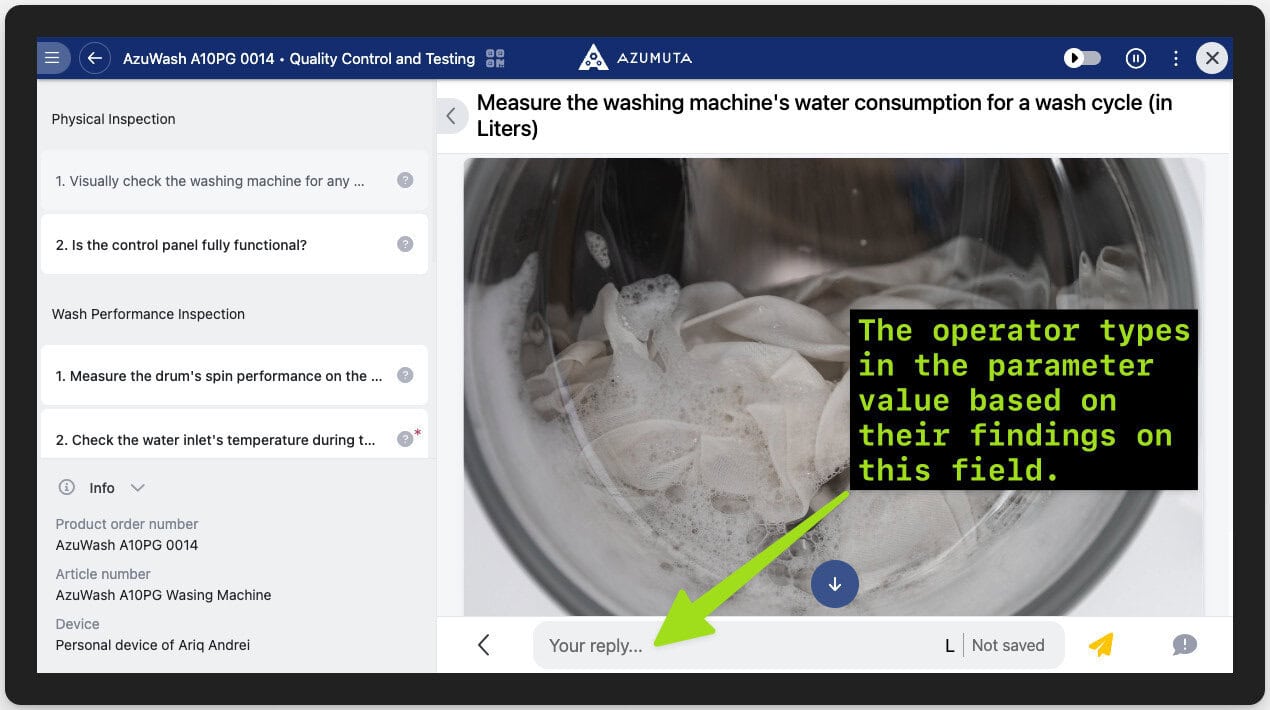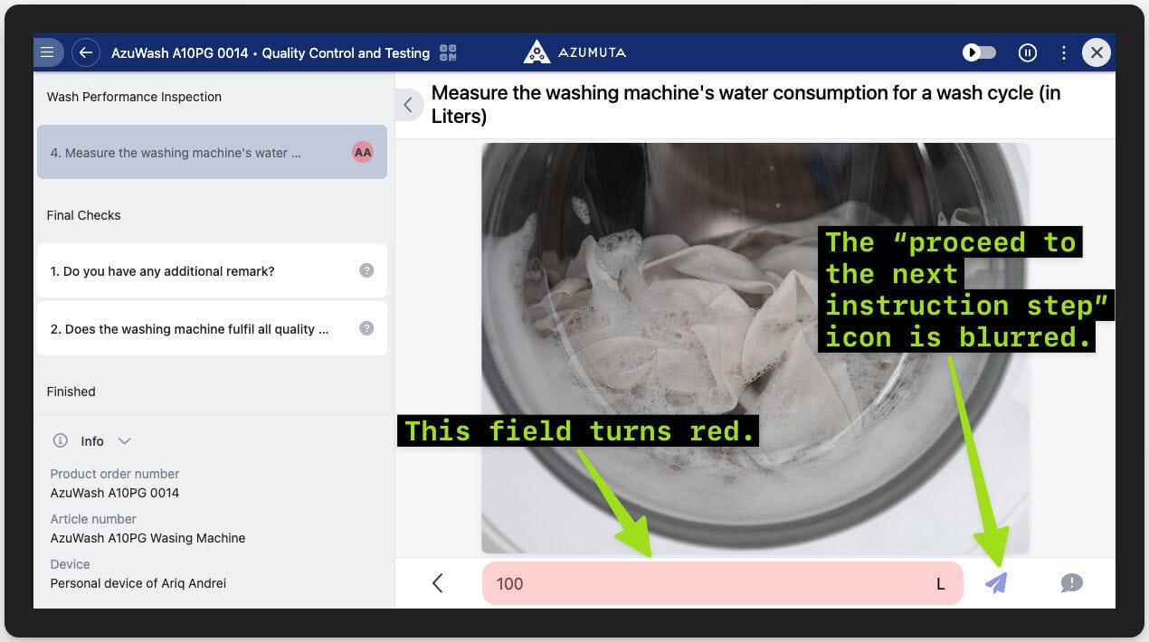 For example, in the image above shows a work instruction for the quality control & testing process of a washing machine. In this instruction step, the operator tests the amount of water that a washing machine consumes when performing a wash cycle. The admin informs the operator that this washing machine should consume 70 L of water in a wash cycle. Therefore, the number “70” appears on the operator’s screen, as shown above.