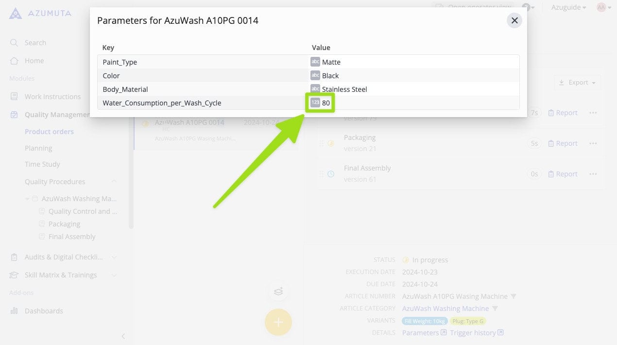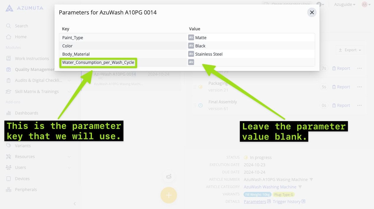 - Asking an operator to input a parameter value in an instruction step when they’re working on a product order. This is commonly used by an admin to request information from an operator about a certain parameter value on the shop floor.