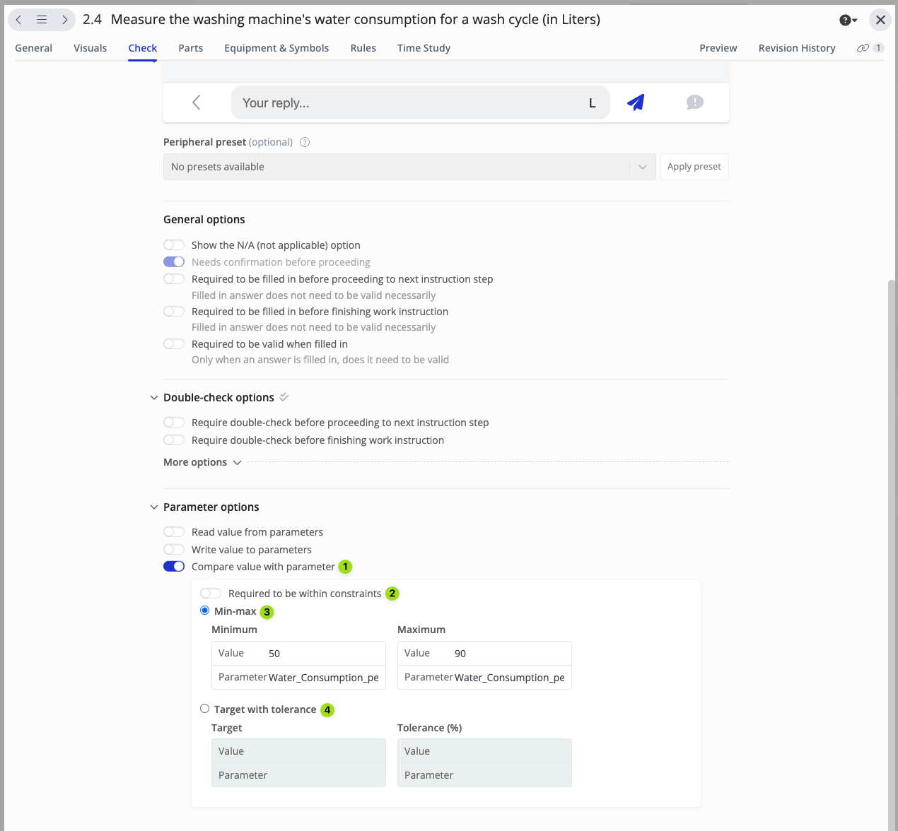 - Navigate to an instruction step where you would like to add a product check with parameter options, and open it.