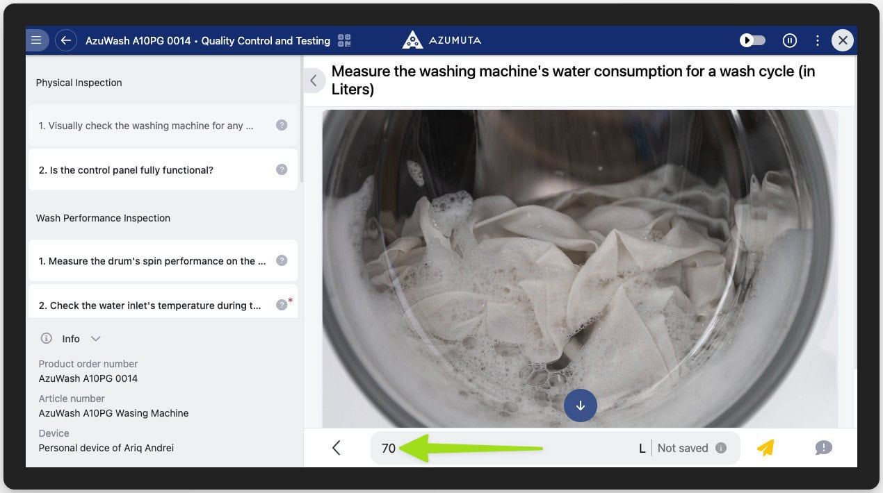 This is how the product check will appear on the operator’s screen. There, the operator can type in the amount of water that the washing machine consumes per wash cycle based on their measurements.