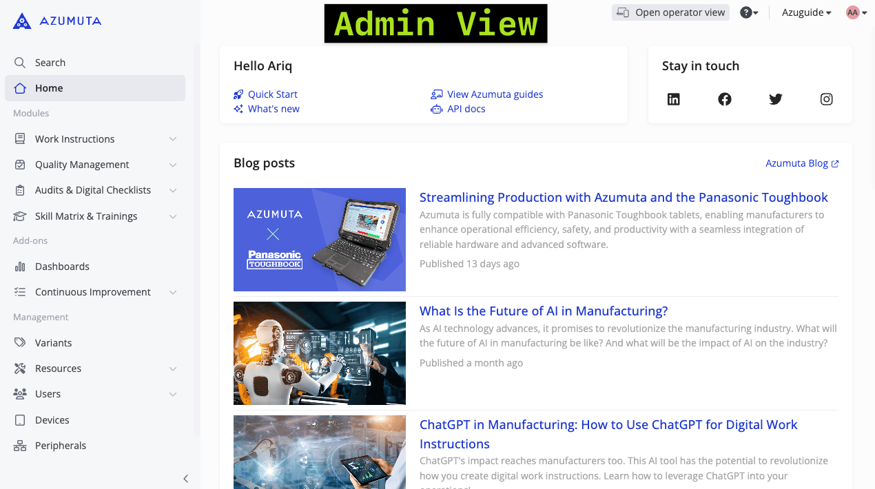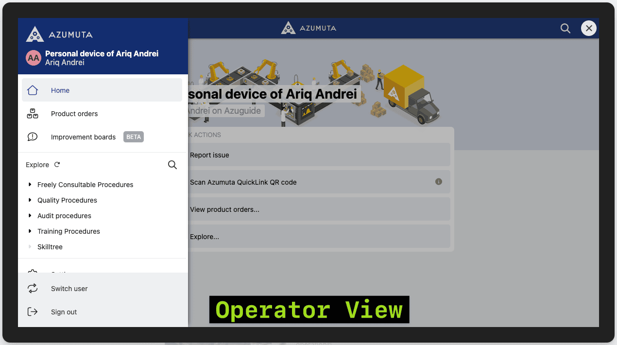 The Azumuta on Web is meant for admins (managers and supervisors who oversee their factory’s operations). Meanwhile, the Azumuta app is tailored specifically for operators, who execute shop floor tasks on a daily basis.