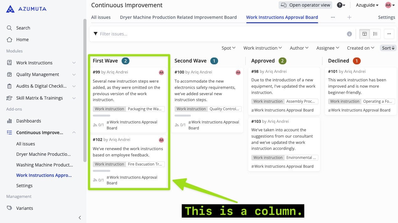 In an approval board, a column represents the status of an approval request, such as the “First Wave” column shown in the screenshot below. On this approval board, there are 4 columns in total (the First Wave, Second Wave, Approved, and Declined columns).