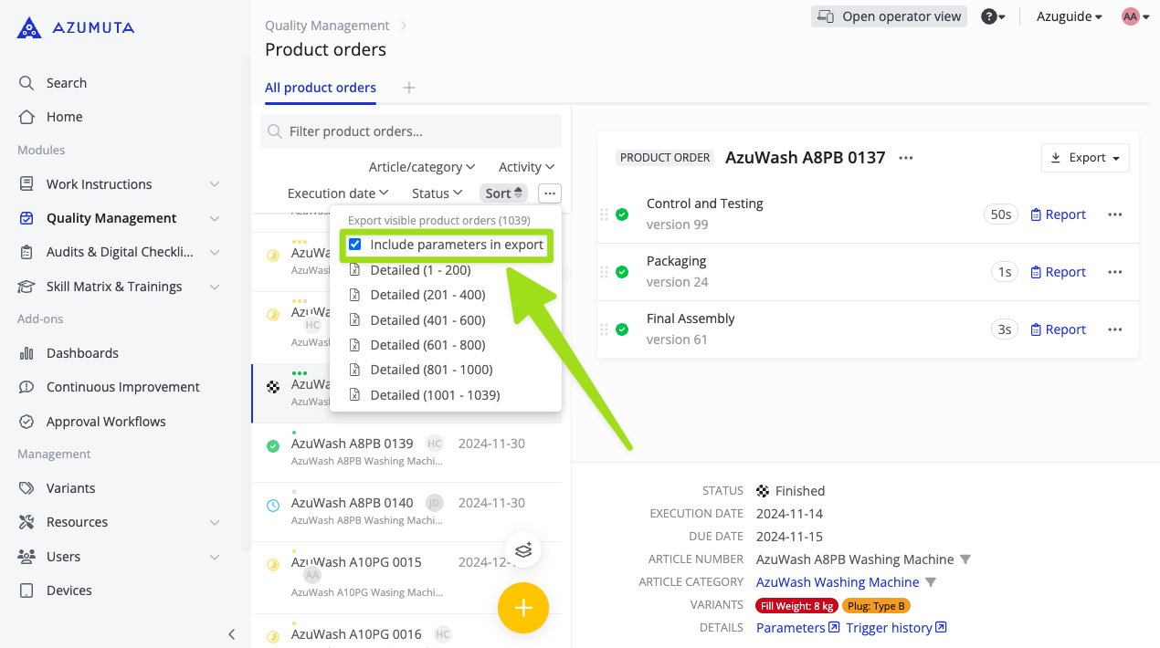 This feature is crucial for manufacturers who need to track product specifications, measurements, and other key details in a structured format. By integrating parameters directly into your product order reports, your team can ensure better quality control, have a more streamlined recordkeeping mechanism, and improve your plant’s overall traceability.