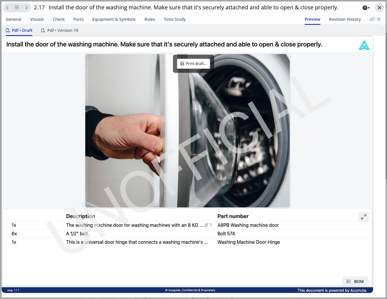 In Azumuta, you can preview a work instruction in PDF format. However, in the past, you were only able to preview an entire work instruction in its PDF format. If you want to only preview a single instruction step, you had to preview the whole work instruction and then manually navigate to that instruction step. This entire process is rather slow and inefficient.