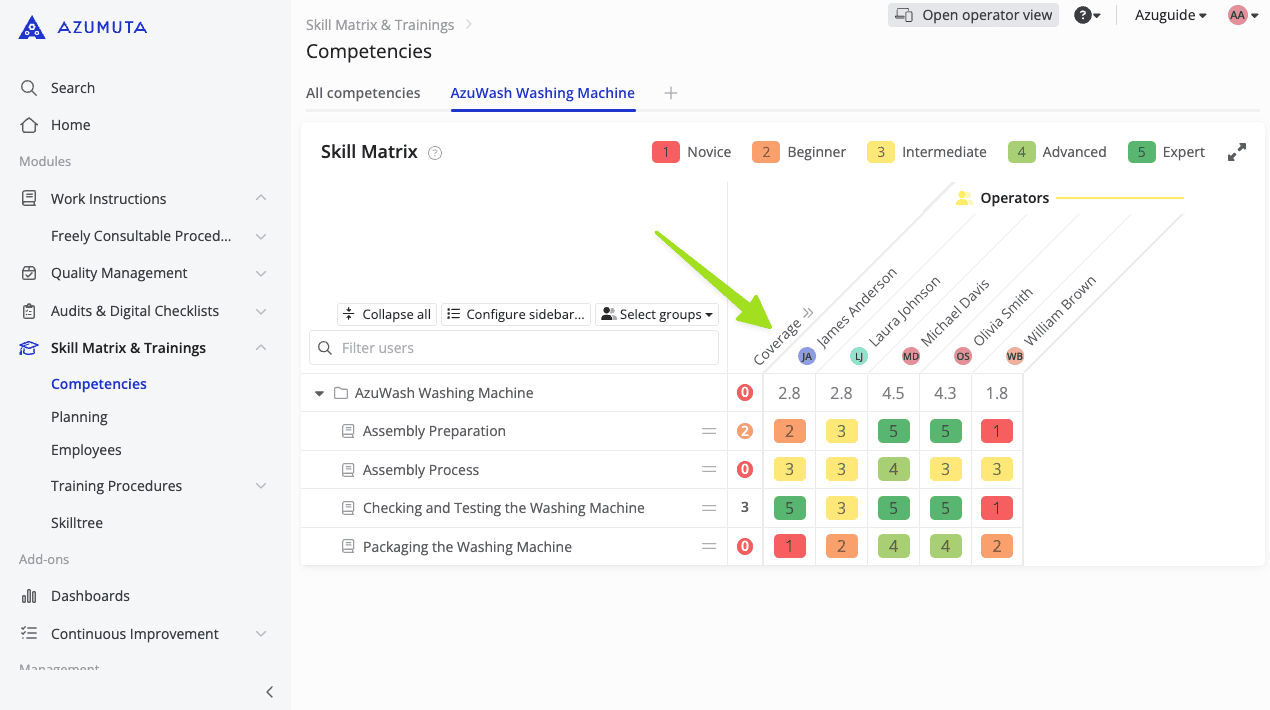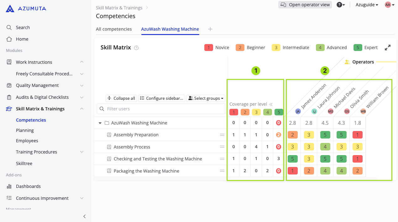 - Coverage per level: This lists the number of operators at a given level for a given process (work instruction) based on the competencies assigned per operator.