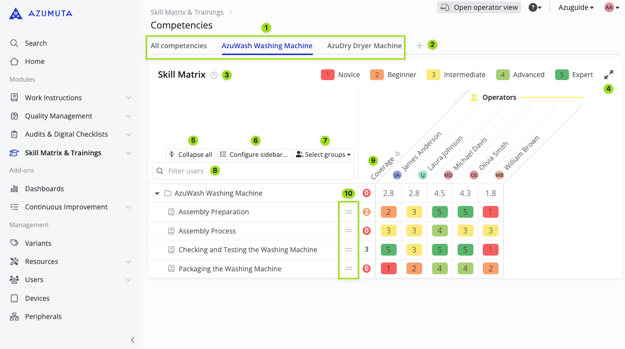 - Competency level per operator: This lists the competency level of an operator for a given process (work instruction).