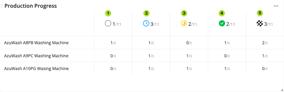 This widget shows you the status of existing product orders on your workspace, grouped based on their article.