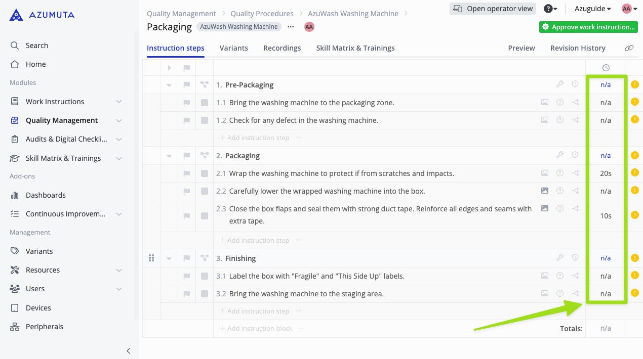 This is a simple yet crucial feature. If an operator spends too little time on a particular instruction step, it might compromise the quality of their work. While if an operator spends too much time on a certain instruction step, it might delay your production process. That’s why it’s important to check the pace of every work instruction step using the Time Study feature.
