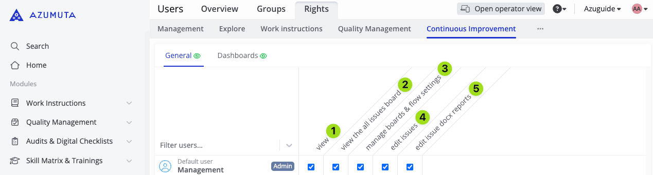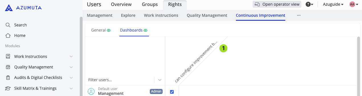 In this guide webpage, we will explain to you about the Continuous Improvement tab. As the name suggests, this tab covers user rights that are related to the Continuous Improvement add-on.