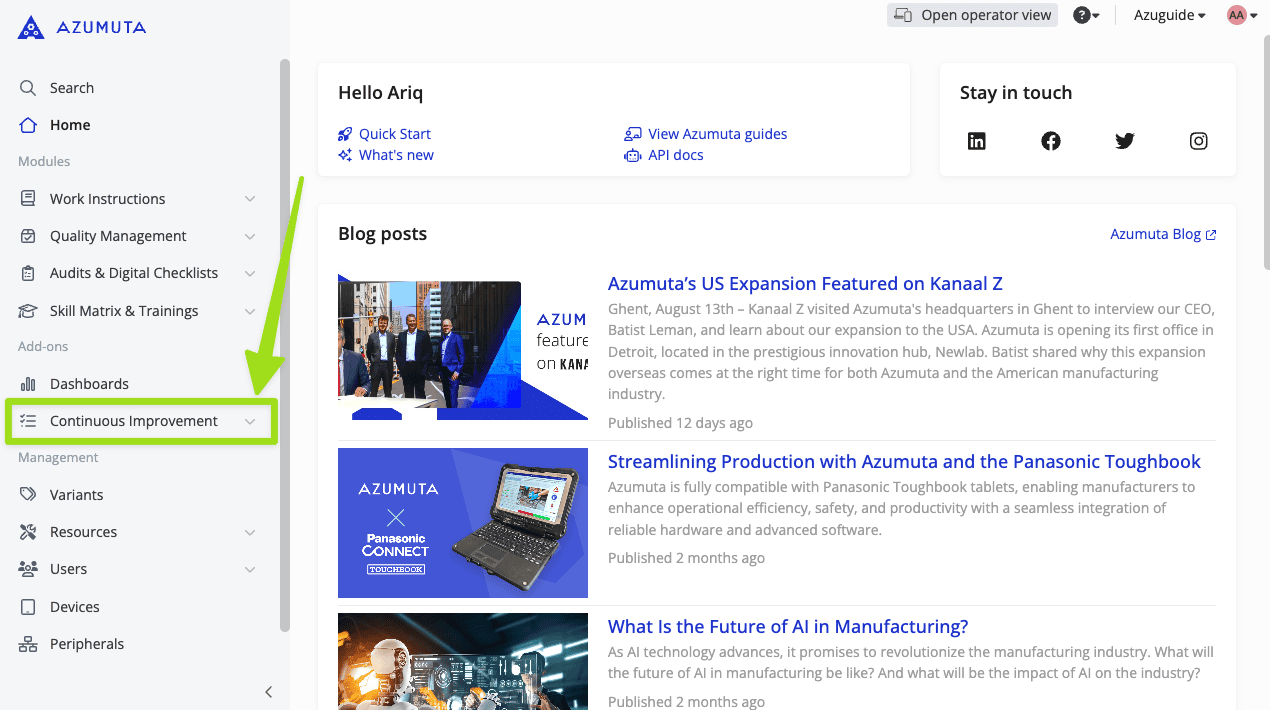 - If ticked, the user can see and access the Continuous Improvement add-on on the sidebar, as shown in the image below: