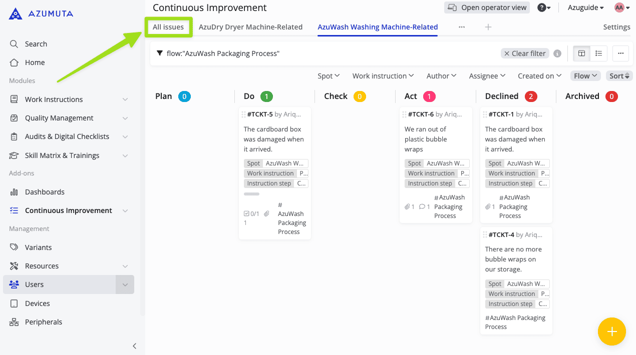 - If ticked, the user can view the “All Issues” improvement board – which displays all of the existing issues in your workspace. Please have a look at the image below to see where this improvement board lies: