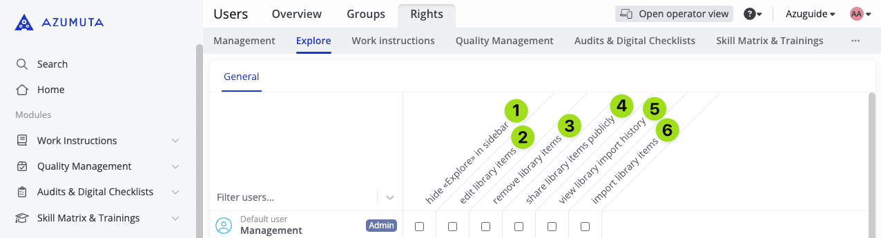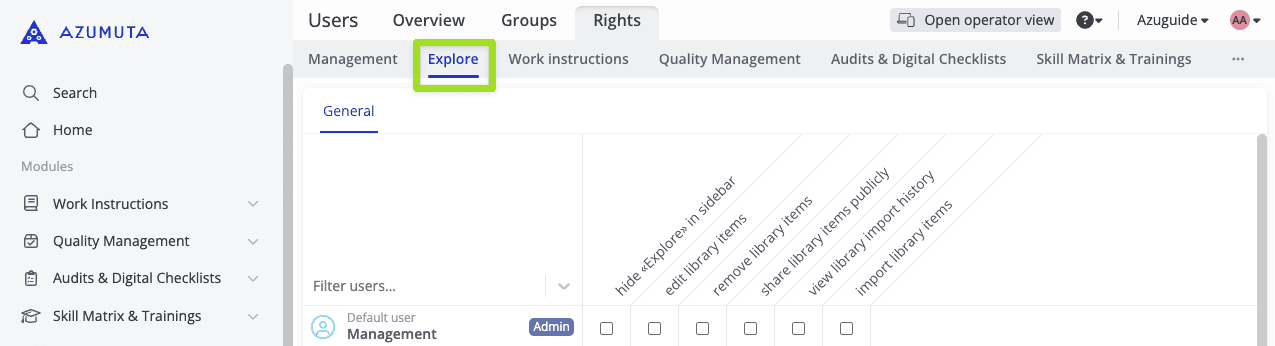- If ticked, the user can share work instructions, articles, and article categories publicly. To use the articles & article categories functionality, you will need access to the Quality Management module. Please contact us through maurice.belpaire@azumuta.com to learn more.