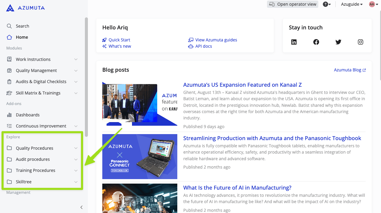 - If ticked, then the Explore section on the sidebar will not be shown on the user’s screen. The Explore section contains library items that were made under the Quality Management module/the Audits & Digital Checklists module/the Skill Matrix & Training module. Take a look at the image below to see where the Explore section lies: