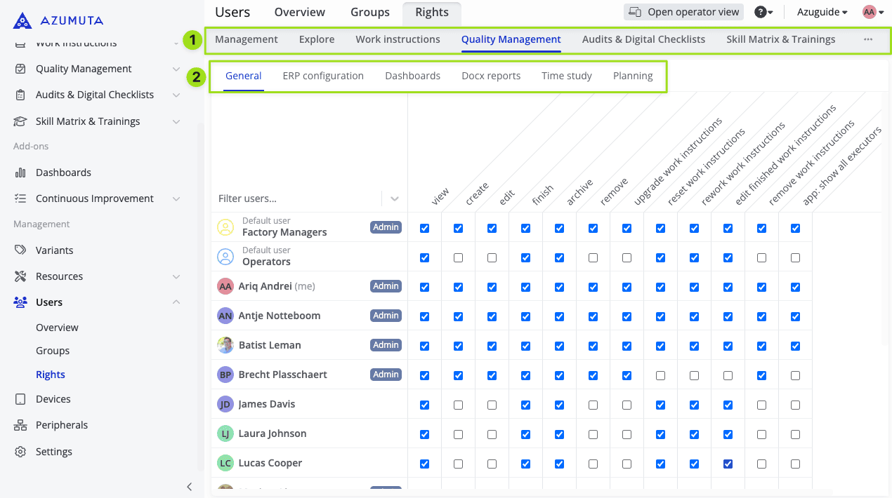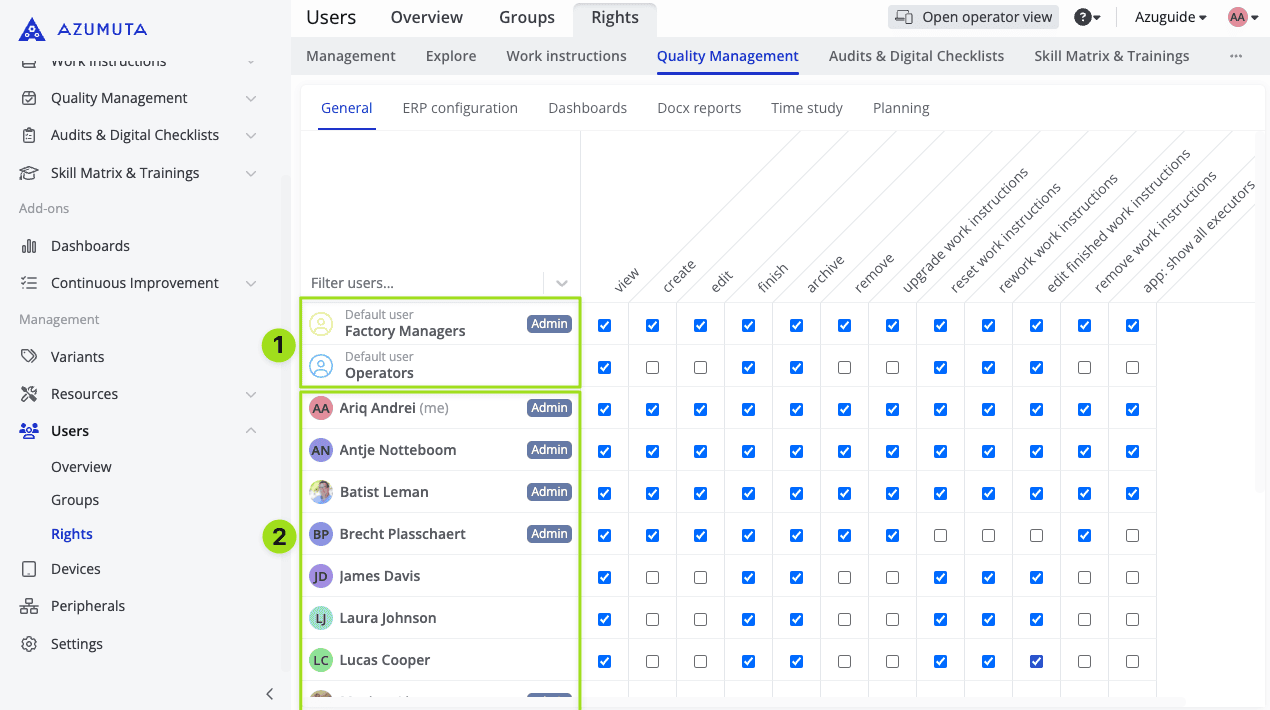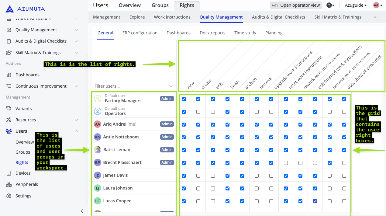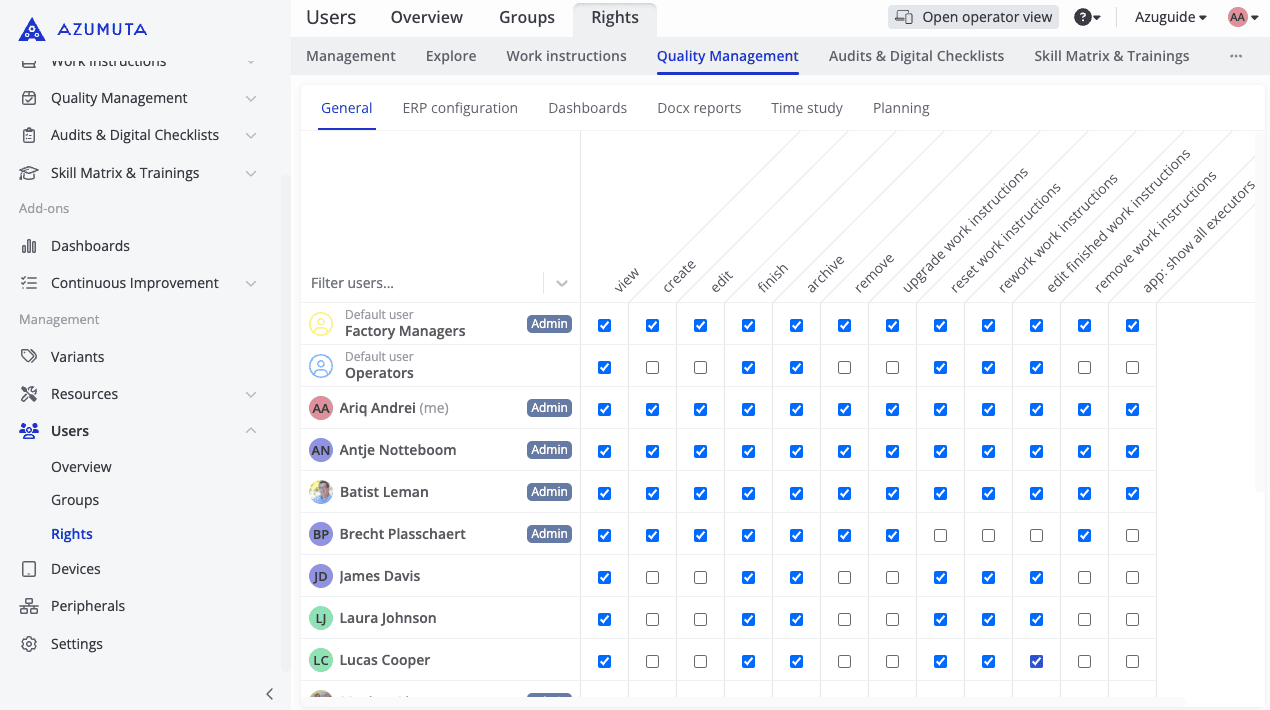 A user right is the authorization that allows a user to perform a certain action in Azumuta. For example, the right to create a work instruction, the right to schedule audits, the right to view dashboards, etc.
