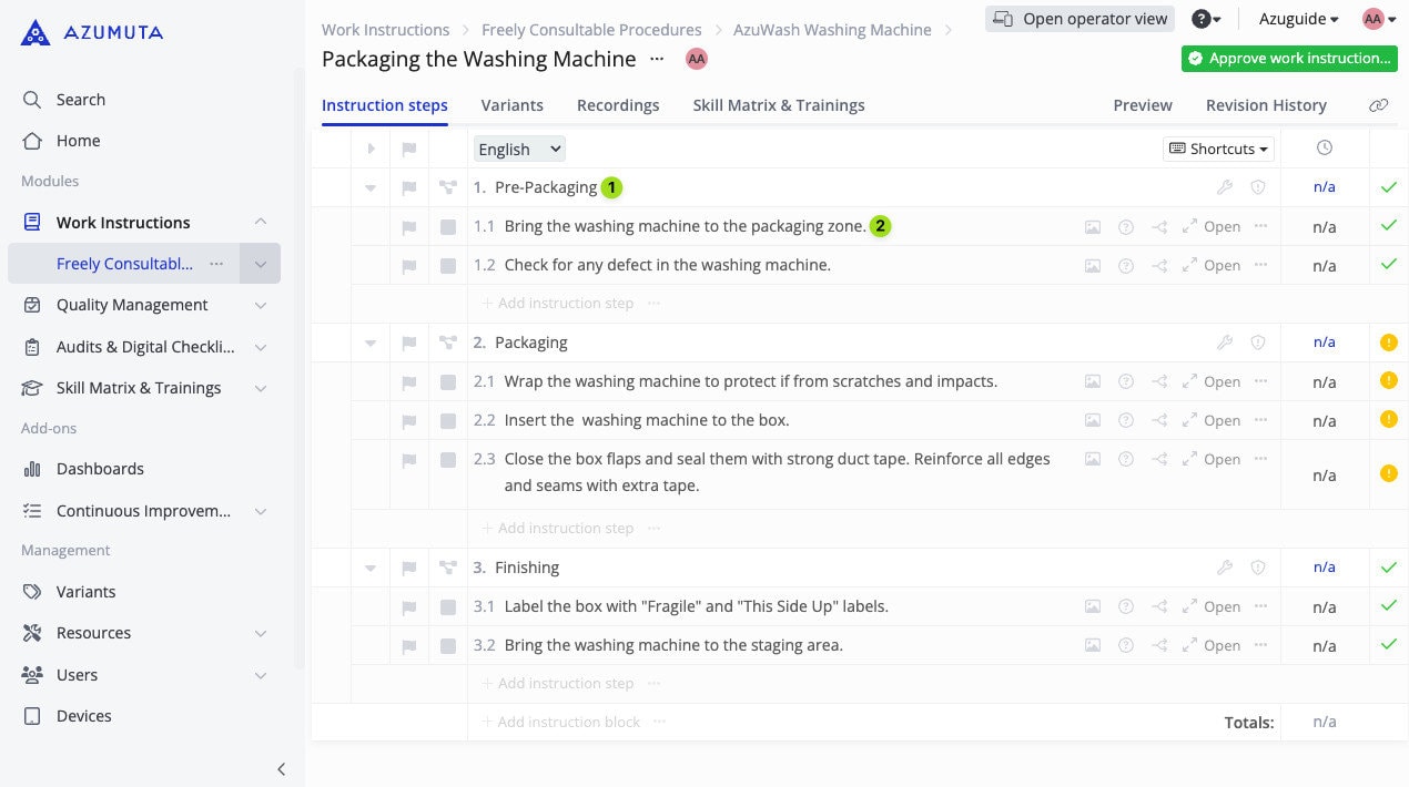 Just as the name suggests, a work instruction is a platform that is used by an admin to give instructions to an operator for executing a certain task on the shop floor. Moreover, in Azumuta, an instruction step within a work instruction can also be equipped with countless supporting features, such as visual elements, product checks, attachments, and many more.