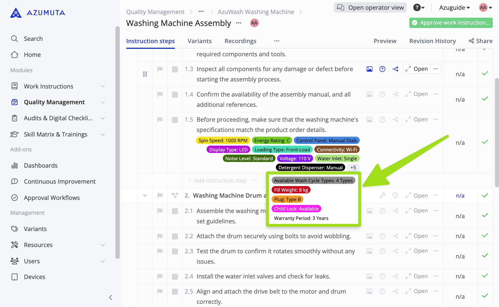 This UI enhancement ensures that any instruction step can accommodate any number of tags – no matter how many – without cluttering the work instruction. This helps users to remain focused – preventing them from being overwhelmed by excessive information from tags.